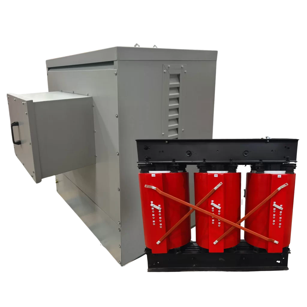 O transformador trifásico de média tensão a seco é encapsulado em resina epóxi vermelha sob alto vácuo, eliminando microbolhas e reduzindo descargas parciais. Disponível de 10 kVA a 2,5 MVA (ou até 5 MVA na linha solar) para tensões de isolamento de 15 kV, 24,2 kV e 36,2 kV, opera em 50/60 Hz, classe térmica F e pode receber invólucros IP21 – IP65. Núcleo step-lap de aço-silício e bobinas de alumínio ou cobre garantem baixas perdas e ruído. Todos os materiais, processos e ensaios seguem ABNT NBR 10295, NBR 5356-1/2/11 e IEC 60076-1; cada unidade é 100 % testada em laboratório próprio.